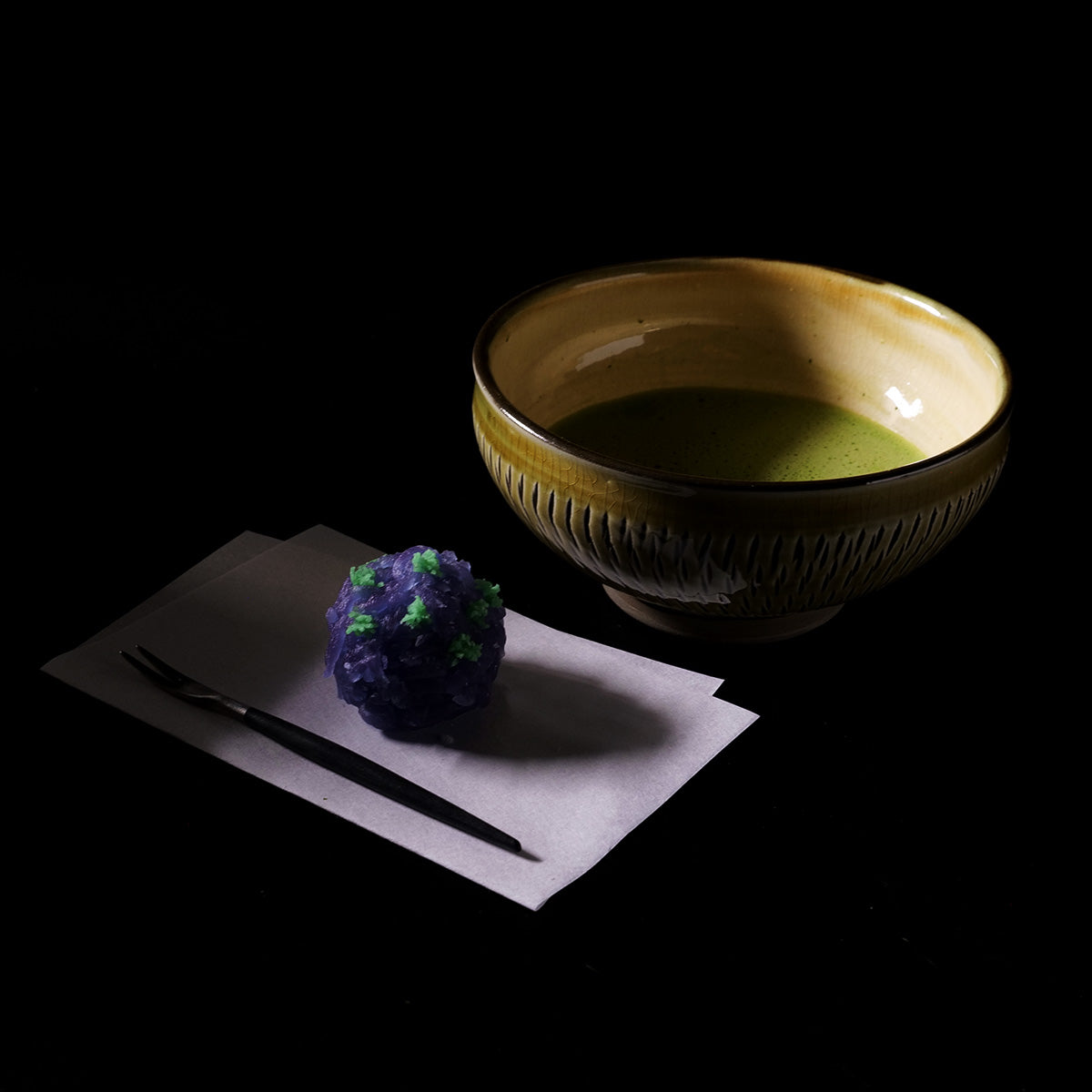 The water color of matcha is creamy and a very vivid yellow-green. When consumed, the tea leaves' concentrated sweetness and umami harmonize comfortably with a firm astringency.